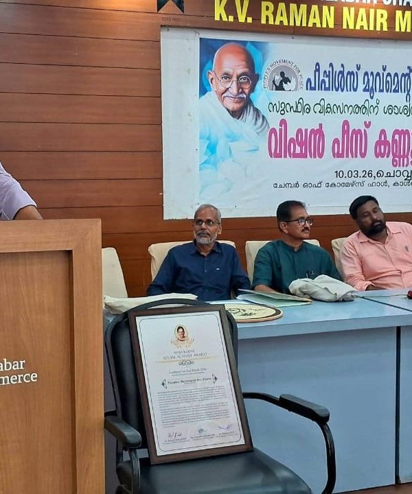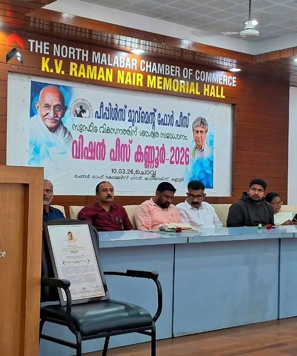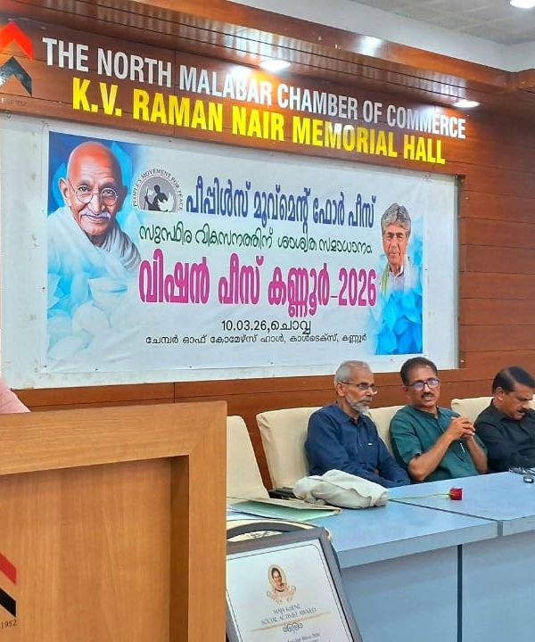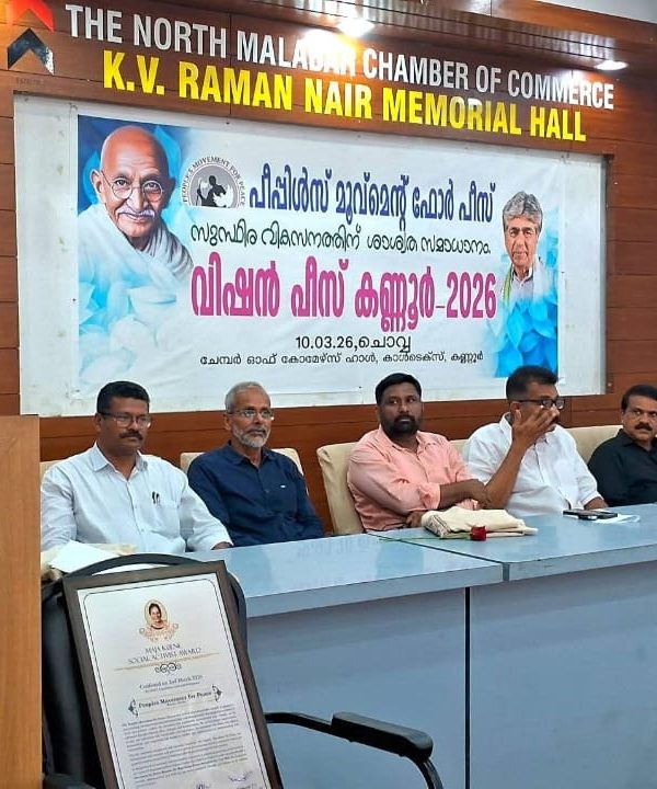 In the backdrop of the 2026 Kerala Legislative Assembly elections, the People’s Movement for Peace (PMP), Kannur, organized a remarkable peace congregation titled “Vision Peace Kannur – 2026” on 10th March 2026 at the Chamber of Commerce Hall. The event aimed to highlight the vital message of “Sustainable Development through Lasting Peace” and underscored the importance of prioritizing constructive discussions on development while ensuring a peaceful election period. The event was inaugurated by Adv. Binoy Kurian, President of Kannur District Panchayat, who reminded attendees of the necessity for a calm and harmonious political atmosphere during the forthcoming elections.
