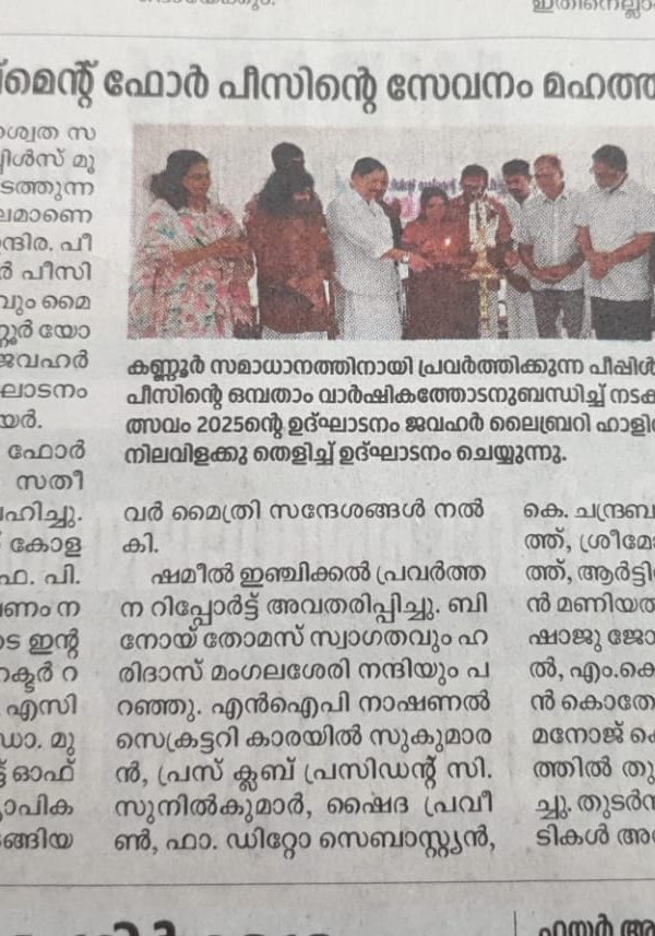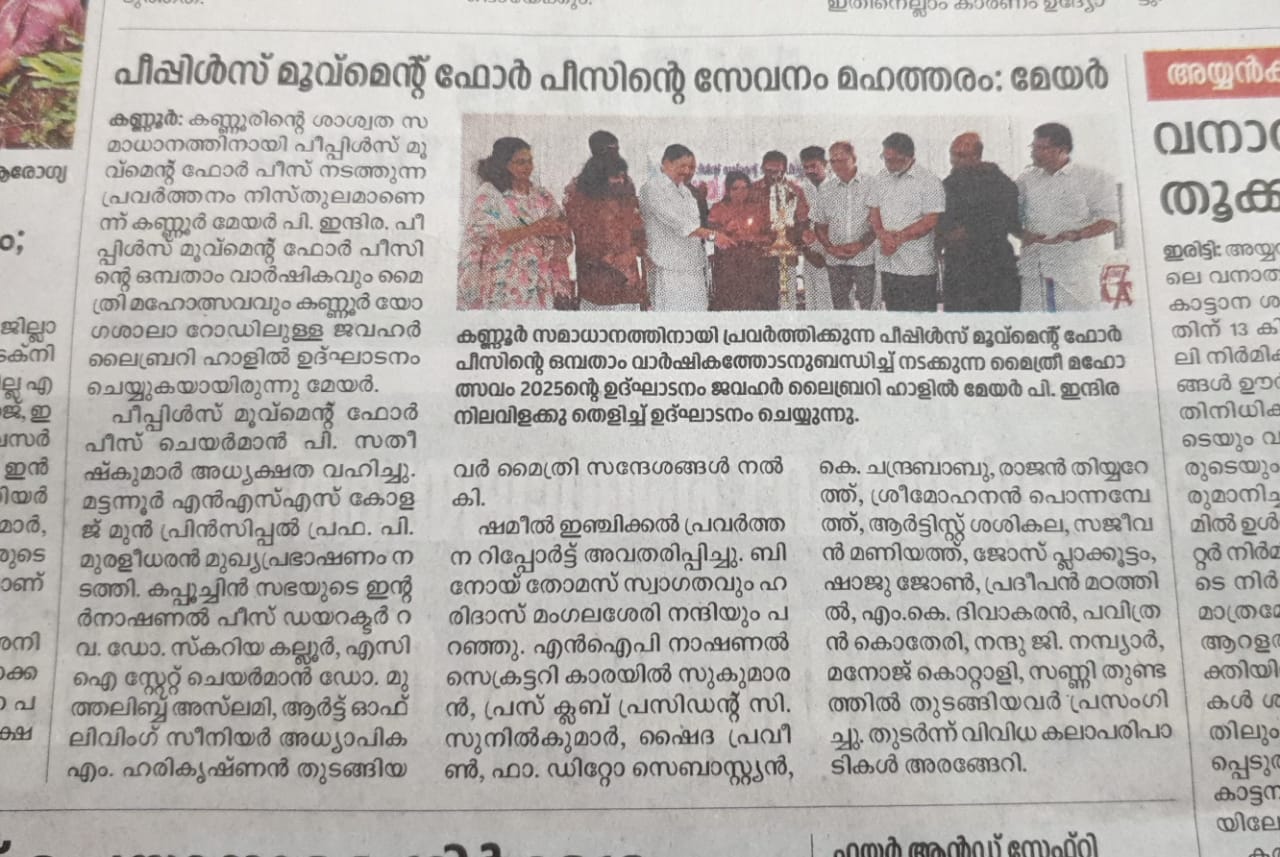 The People’s Movement for Peace, an organisation steadfastly committed to ensuring lasting peace in Kannur, celebrated its ninth anniversary along with Maitri Mahotsavam in a dignified and vibrant manner. The programme was held at the Jawahar Library Hall, Kannur, and was inaugurated by Honourable Kannur Mayor Adv. P. Indira. 🤝 In her inaugural address, the Mayor lauded the Movement, stating that “The contributions of the People’s Movement for Peace towards ensuring enduring peace in Kannur are truly unparalleled.” Her words reaffirmed the relevance of sustained civic engagement in nurturing harmony in a region historically affected by conflict.