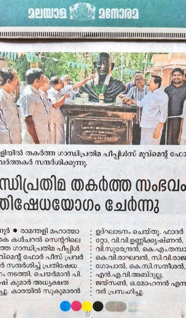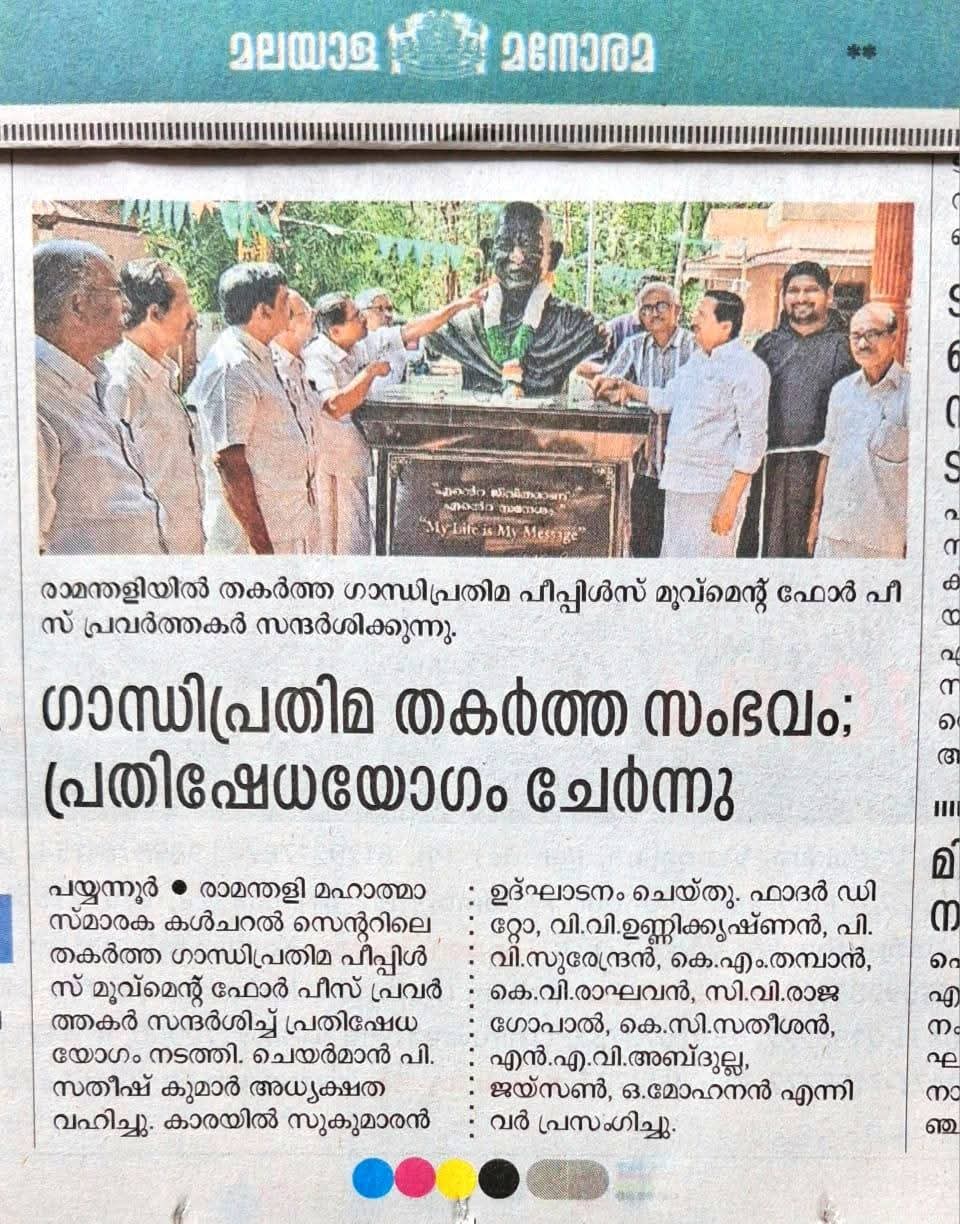 The vandalism of the Gandhi statue at the Mahatma Memorial Cultural Centre, Ramanthali, Payyannur, is an act that deserves the strongest condemnation. In response to this deeply unfortunate incident, activists of the People’s Movement for Peace, an organisation committed to the values of harmony and non-violence, visited the site and organised a strong protest meeting expressing collective outrage and concern. The protest meeting was held under the chairmanship of P. Satheesh Kumar and was inaugurated by noted social activist Karayil Sukumaran. Speakers at the meeting included Fr. Ditto, V. V. Unnikrishnan, P. V. Surendran, K. M. Thampan, K. V. Raghavan, C. V. Rajagopal, K. C. Satheeshan, N. A. V. Abdulla, Jaison, and O. Mohanan. All speakers strongly reaffirmed the relevance of peace, tolerance, and non-violence in the present social climate.